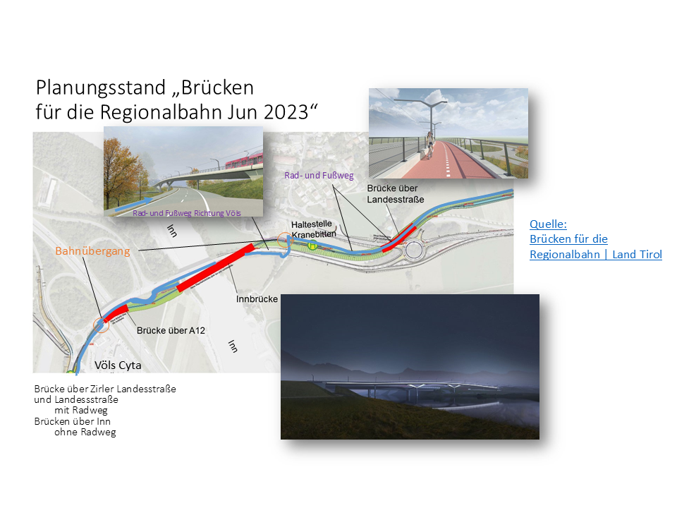 2023 wurden vom Land Tirol die Brücken für die Regionalbahn präsentiert. Dabei waren zwei beschrankte Bahnübergänge eingeplant.