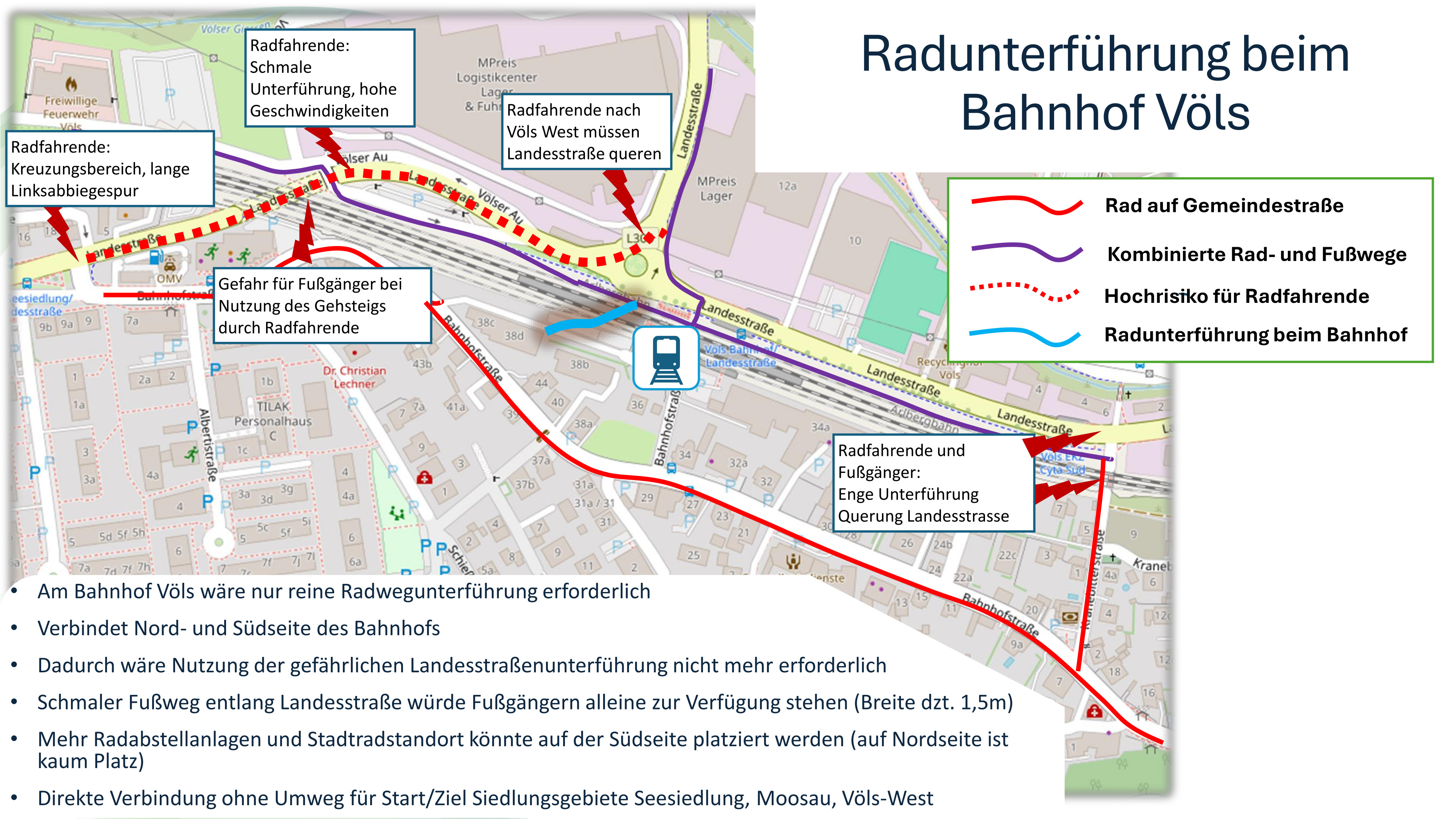Künftig ist eine weiter steigende Bedeutung durch geplanten neuen Stadtteil „Harterhof-Siedlung“ (zusätzlich ca. 1500 Wohnungen und ca. 700 Arbeitsplätze) zu erwarten. Derzeit ist die Strecke zwischen Bahnhof Völs und Innsbruck Technik ca. 2,5km lang (10min mit Fahrrad).